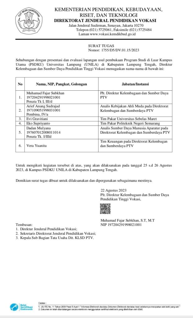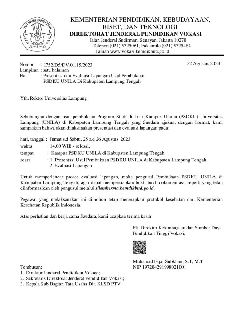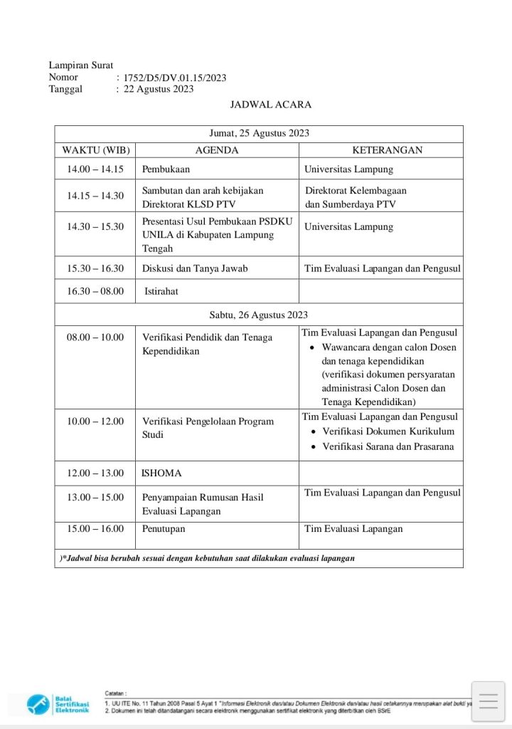Dalam rangka visitasi lapang usulan pembentukan Prodi D3 Keuangan dan Perbankan Program Studi Diluar Kampus Utama (PSDKU) Kampus Lampung Tengah, yang akan dilakukan selama 2 hari (25-26 Agustus 2023) oleh tim Kementrian di kampus PSDKU Lampung Tengah, telah dilakukan rapat koordinasi antara Universitas Lampung dan Pemerintah Kabupaten Lampung Tengah, dalam diskusi ini hadir Wakil Rektor 4 Unila, Ketua LP3M, Tim Taskforce PSDKU Unila, Asisten 1, Kepala Dinas, dan bidang terkait. Seluruh stakeholders telah sepakat untuk sepenuhnya mendukung atas rencana dibentuknya Prodi ini, termasuk membahas persiapan sarana dan prasarana perkuliahan, dan program strategis yang berkelanjutan.
