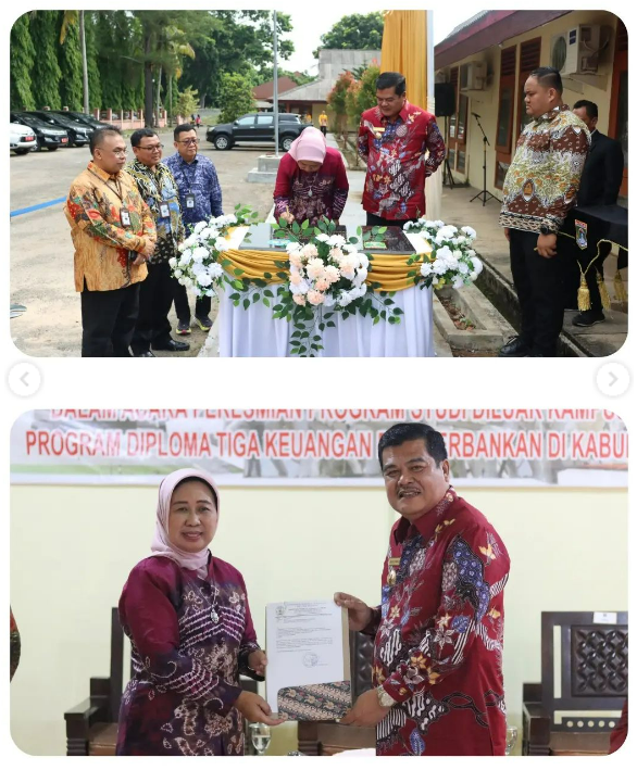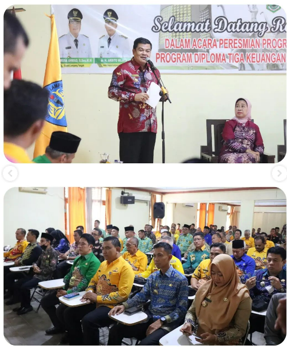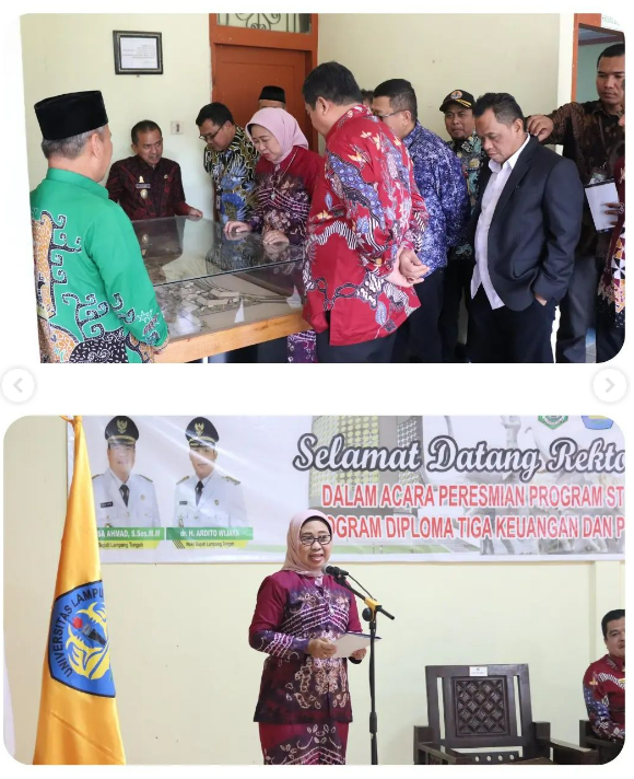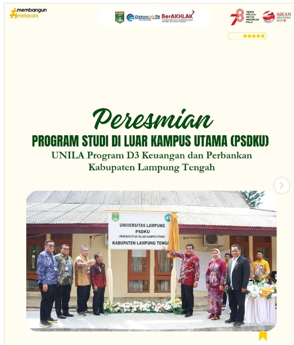 LAMPUNG TENGAH, DAILYLAMPUNG.COM – Peresmian Program Studi Diluar Kampus Utama ( PSDKU) Unila Program D3 Keuangan dan Perbankan di Kabupaten Lampung Tengah bertempat di Gedung Bandiklat Kotagajah pada. Jumat, (22/12/2023). Dalam kesempatan tersebut turut hadir ketua tim PSDKU Unila, Sekda, Lampung tengah dan Jajaran Wakil Rektor, serta Kepala Perangkat Daerah, para Camat, Kepala Kampung, serta masyarakat.